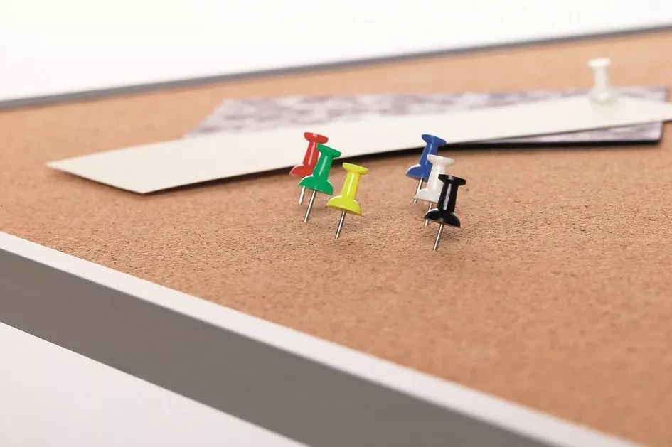 Pinboards with a beige pin surface, made of the natural product cork. Equipped with anodized Softline profile with gray plastic corner pieces.