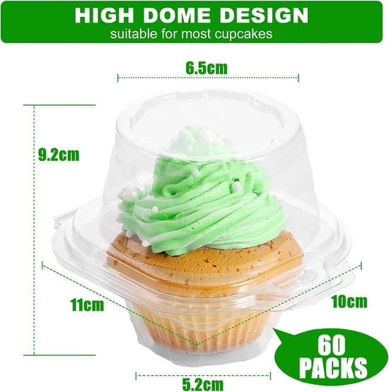 [Size] 11cm x 10cm x 9.2cm, a total of 60pcs plastic clear cupcake boxes, it can be stacked, which saves space and protects the cupcake from deformation, and easy to carry