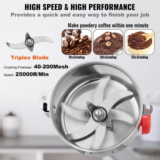 Instructions for use: 1. The commercially available coffee grinder may only be put into operation when the lid is completely closed. 2. The grain must be sufficiently dry. 3. Let the appliance rest for 5 to 10 minutes after every 5 minutes of operation. 4. Make sure that the blade covers the long blade and no more than 2/3 of the bowl. 1/2 of the container is optimal. 5. Do not clean the grinding container directly with water. Instead, use a dry cloth or brush.