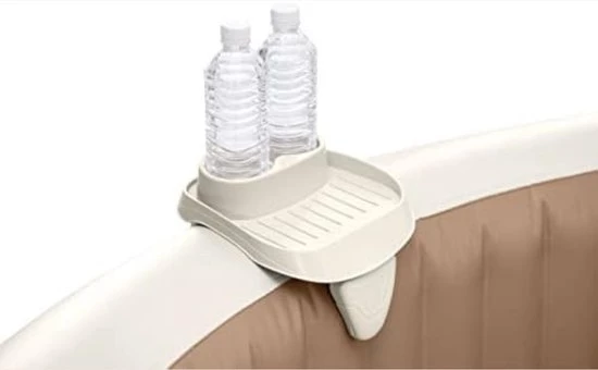 The cup holder and refreshment tray are designed to be securely attached to the spa wall