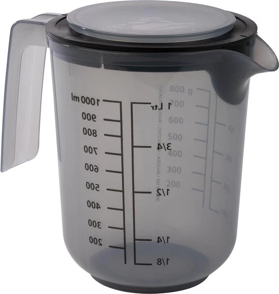 This grey measuring cup is the perfect kitchen aid for accurately measuring liquids, sugar and flour. With its handy lid it can also serve as a mixing cup, making overfilling a thing of the past.