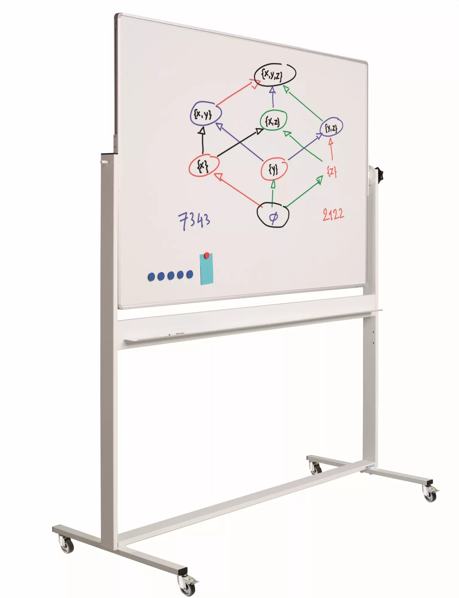 Double-sided writable tilting board made of white lacquered steel with aluminum RC profile. The board can be rotated 360° using the rotary knob and can be fixed in any angle. The robust white steel base is equipped with a long pen tray and 4 solid industrial wheels (2 with brakes), making it suitable for intensive moving.