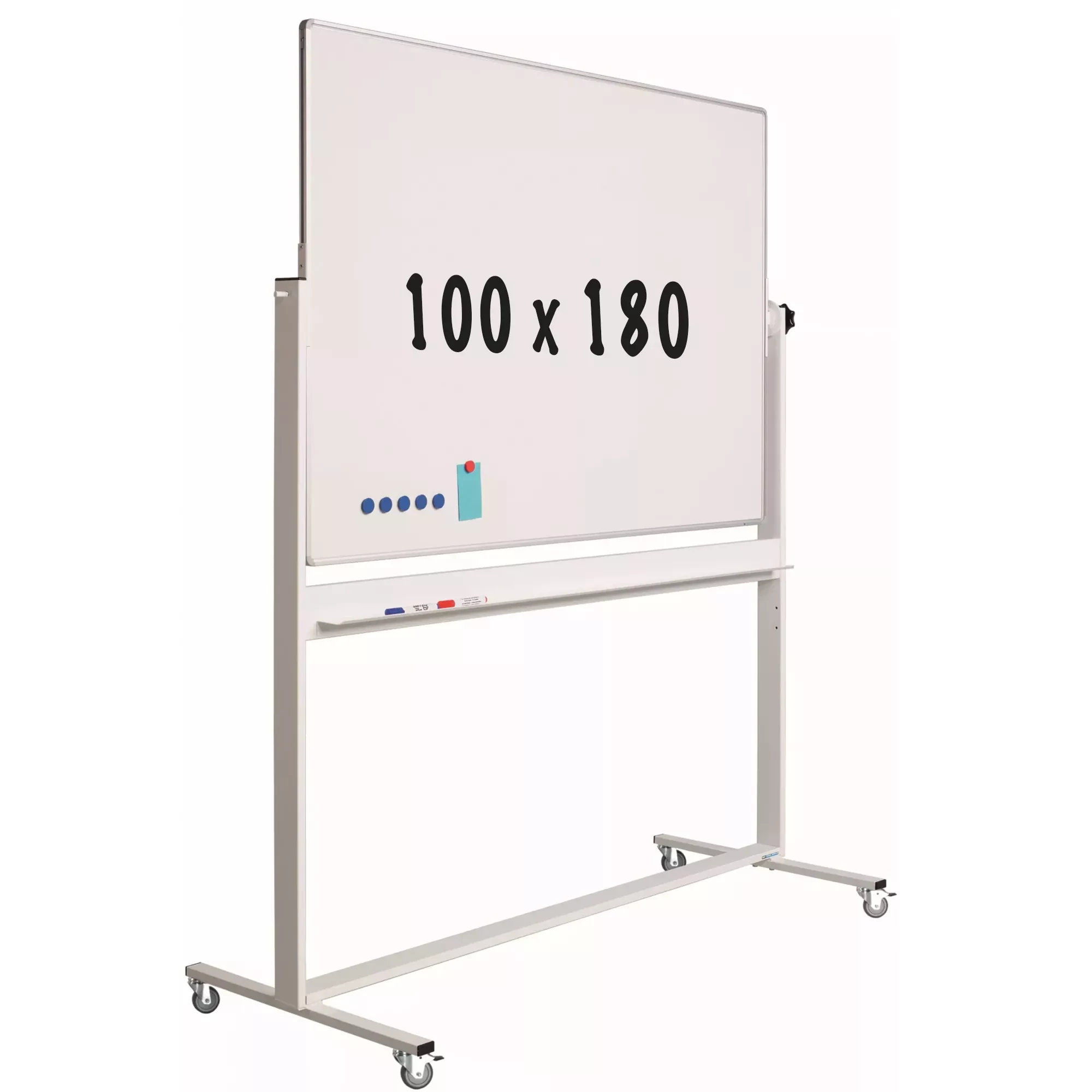 Double-sided writable tilting board made of white lacquered steel with aluminum RC profile. The board can be rotated 360° using the rotary knob and can be fixed in any angle. The robust white steel base is equipped with a long pen tray and 4 solid industrial wheels (2 with brakes), making it suitable for intensive moving.