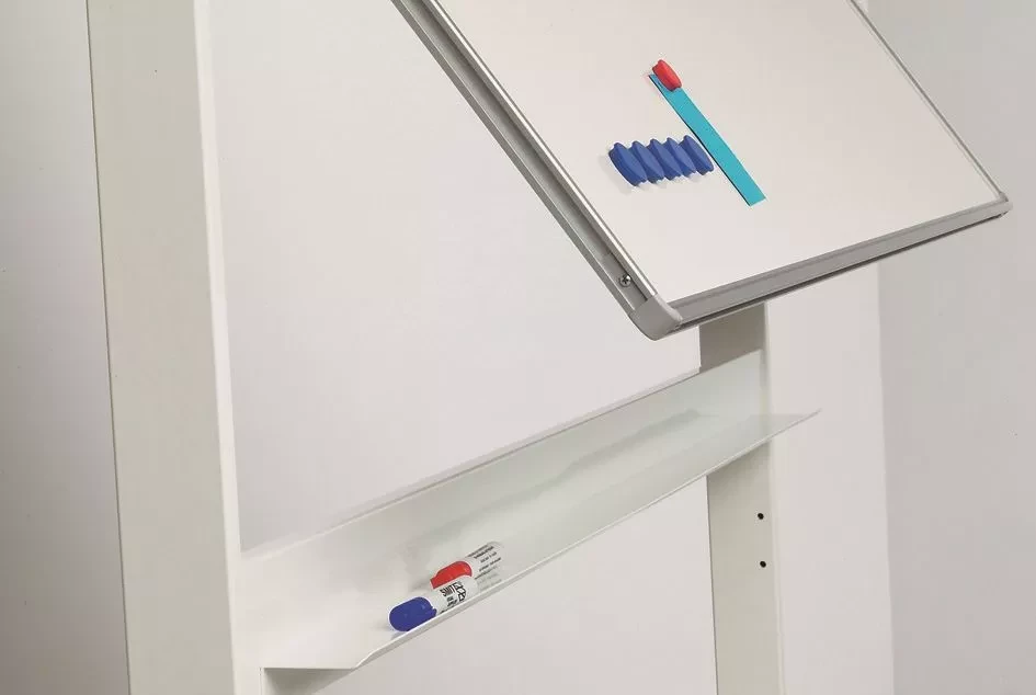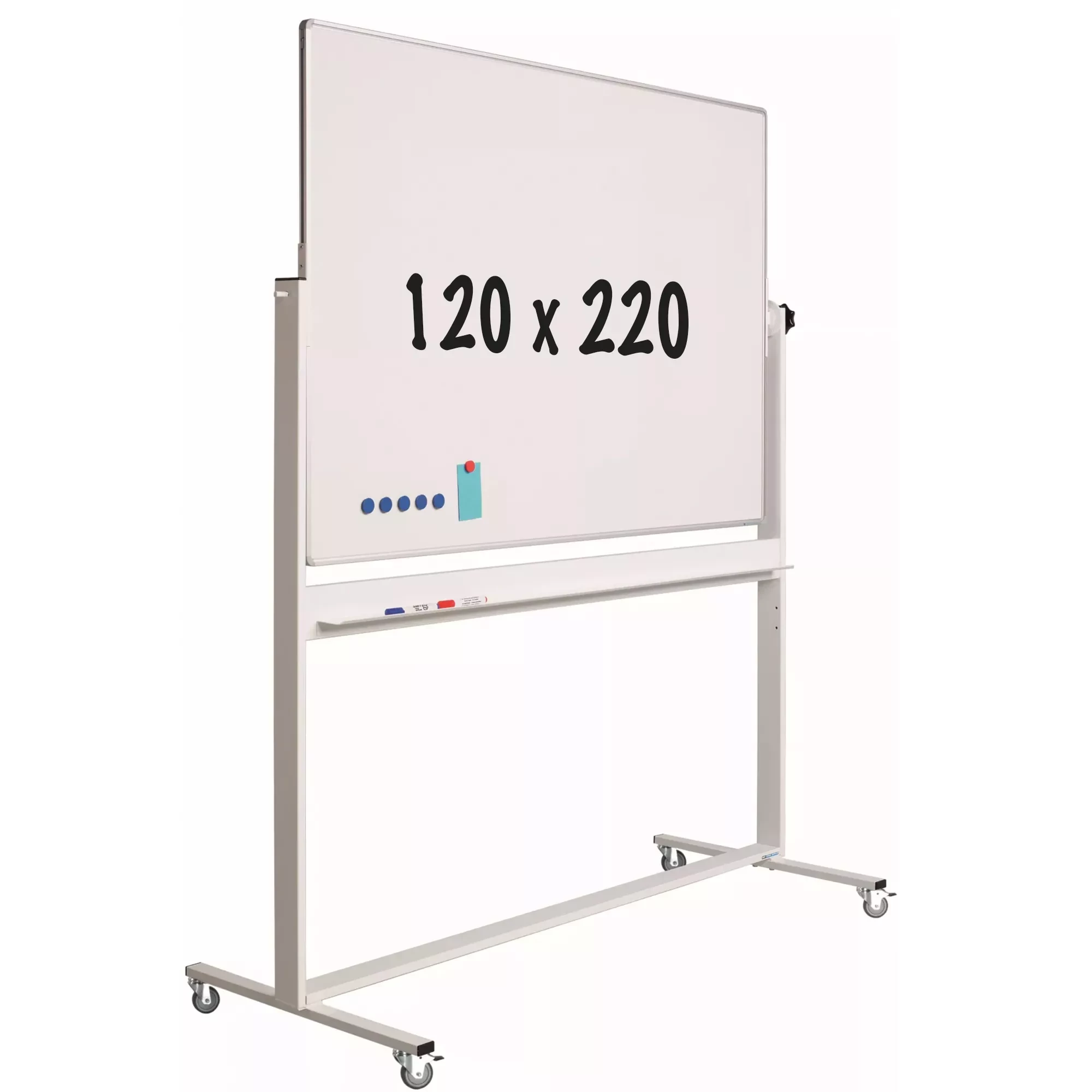 Whiteboard that can be written on on both sides of white enamel steel, with aluminum RC profile. The board can be rotated 360 by means of the rotary knob and can be fixed in any corner. The robust white steel rack is equipped with a long marker tray and 4 industrial wheels (2 with brakes), making it suitable for regular or intensive movement over uneven floors.