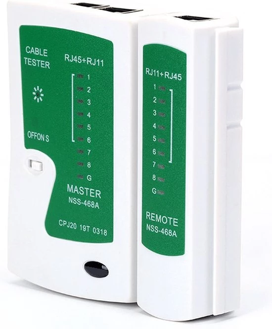 Complete tester set for testing RJ11, RJ12, RJ45, 10/100 Base-T, TIA 568A/568B, AT&T 258A, BNC, Cat. 5, etc. For 4-, 6-, and 8-pin modular connectors. Nine LEDs indicate connection quality, allowing you to detect faulty connections, short circuits, and open wiring. Use this set to test network and telephone cables for continuity, short circuits, wire swaps, and cable faults.