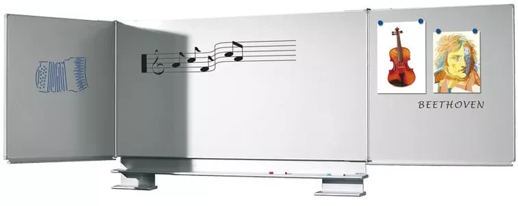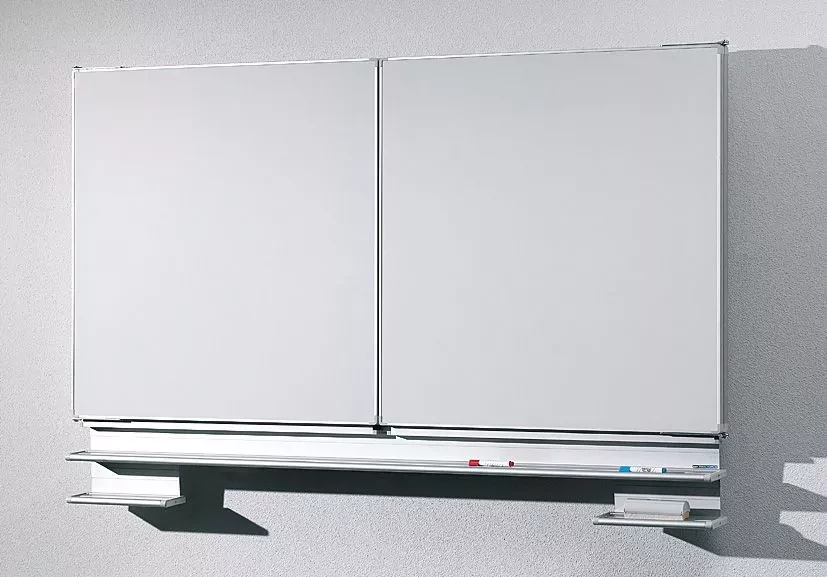 Board with 5 writing surfaces in enamel steel white (800C) or green. Anodized 19 mm aluminum profile with plastic corner pieces, including marker tray with two sponge trays and chalk collection trays at the bottom of the wings. Mounting on a fixed wall.