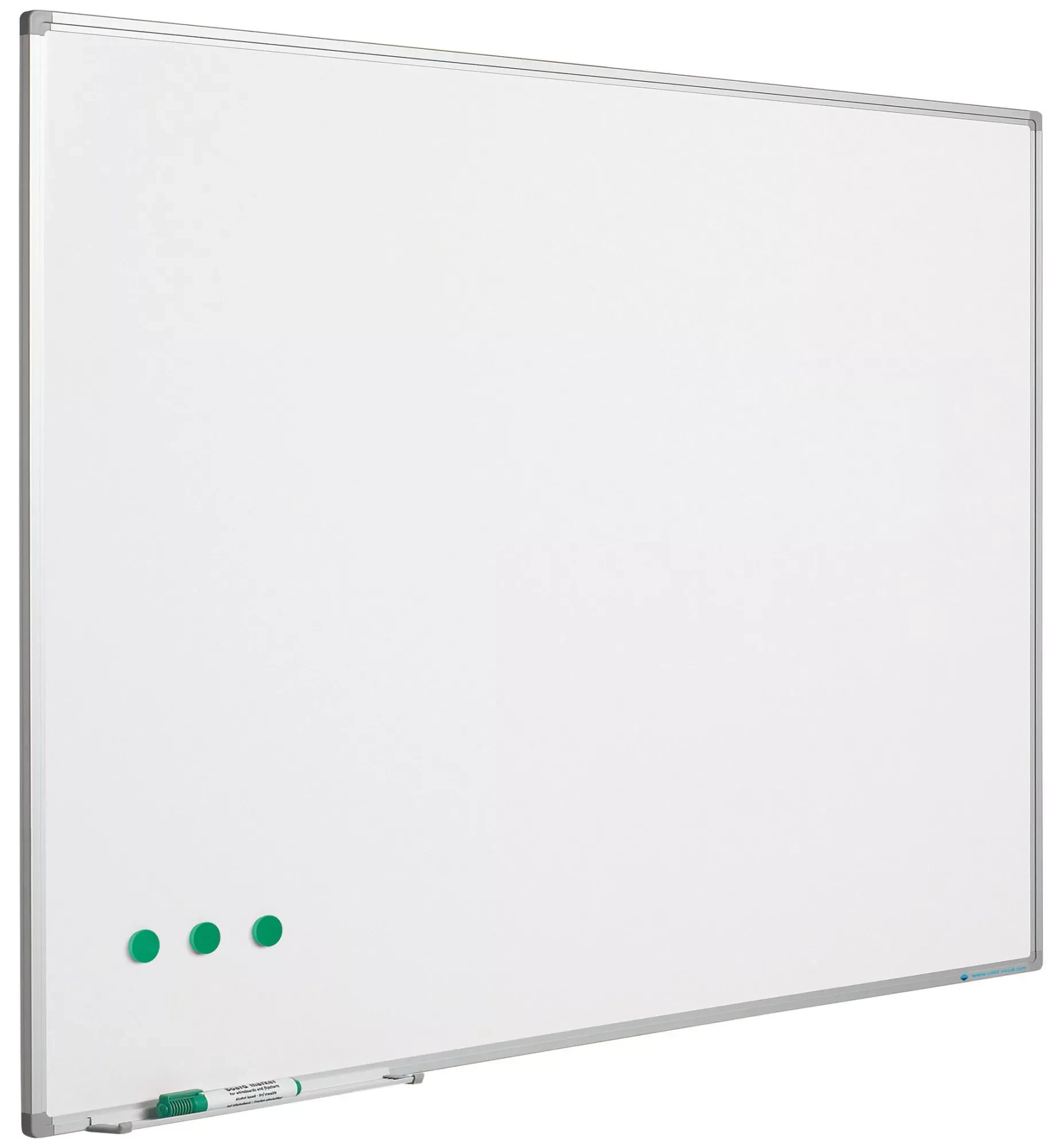 High quality white enamelled steel whiteboard (800C). Whiteboard for very intensive and durable use. Anodized aluminum Softline profile with plastic gray corners.Including marker tray of 30 cm.