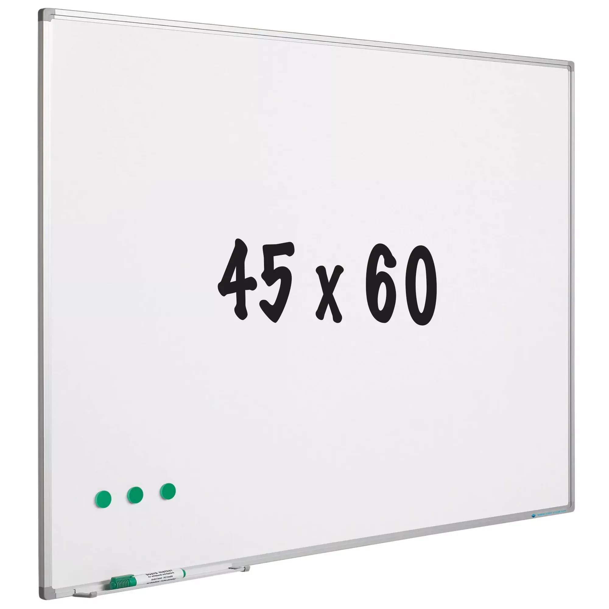 Whiteboard in white lacquered steel. A cost-effective alternative to normal whiteboards. Anodized aluminum Softline profile with plastic gray corners. Including marker tray of 30 cm