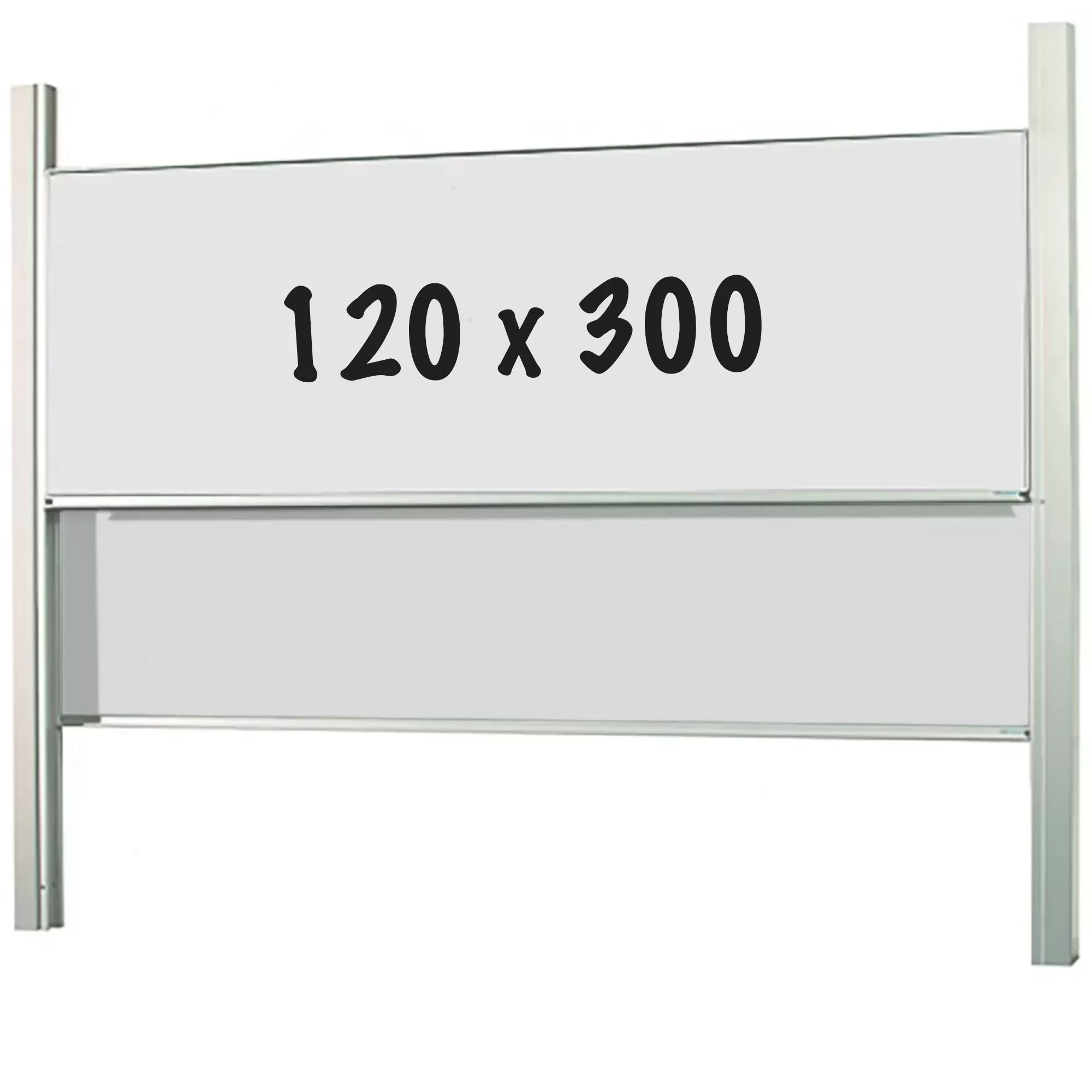 Two single-surface boards that can move independently of each other in height in white (800C) or green enamel steel. Anodized 19 mm aluminum profile with plastic corner pieces and chalk collection gutter. Mounting between two double columns, standard length: 265 cm. Longer columns: optional.
