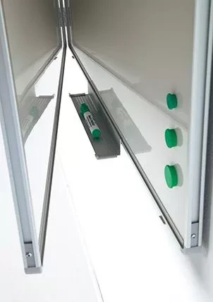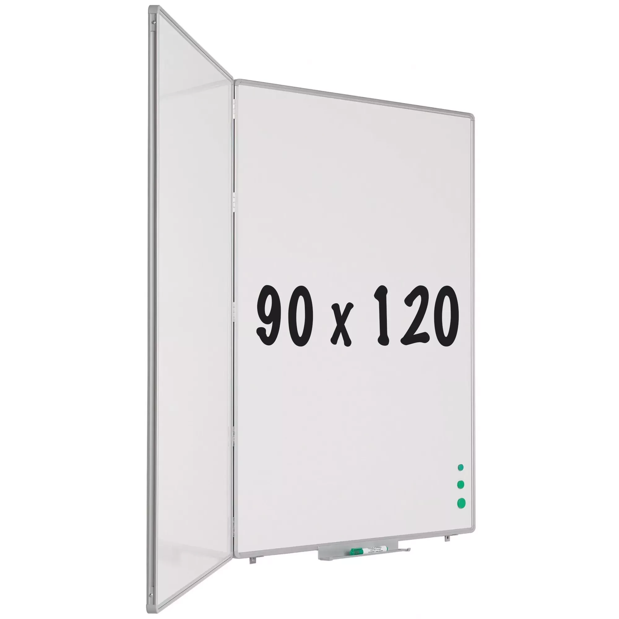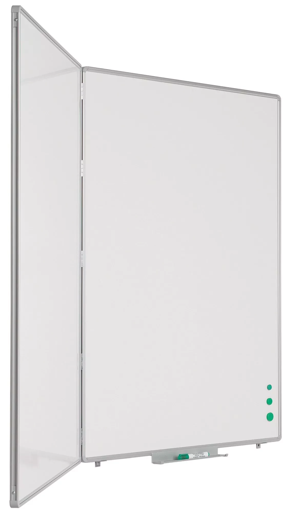 Whiteboard with three writing surfaces of white enamel steel (800C). Extra wings provide more writing space. Anodized aluminum RC profile with gray plastic corner pieces. Including deposit tray.
