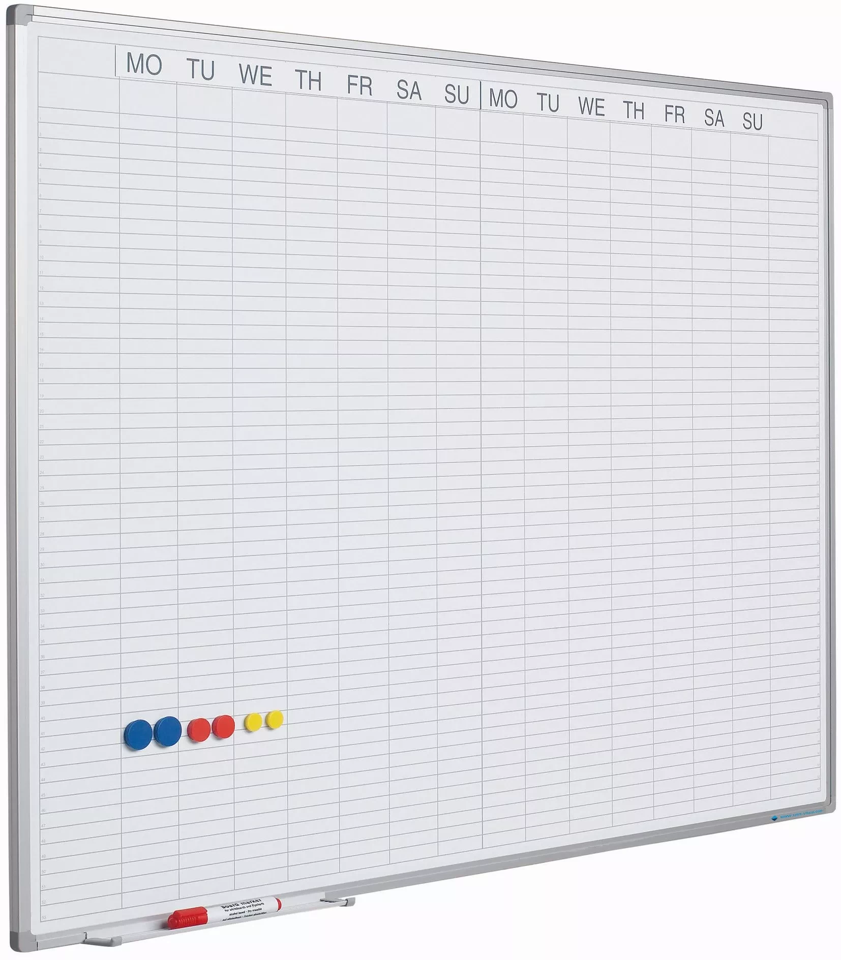 Weekly planner with horizontal two weeks side by side. Under each day there are 53 free positions. Equipped with anodized aluminum softline profile, including suspension material, marker tray 30 cm and magnetic day strip for double weekly planner.