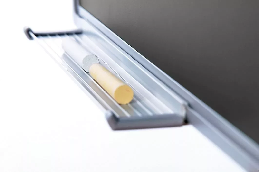 Chalkboard in green or gray enamelled steel. Magnetic and erasable. Anodized aluminum softline profile with plastic gray corners. Including hanging material and marker tray of 30 cm.