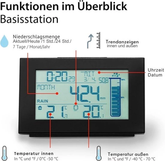 Multifunctional Base Station : The base station is equipped with a digital radio clock, alarm clock with snooze function and two alarm times. It also has a perpetual calendar with date and day display, trend display, memory function and an individually programmable rain alarm.