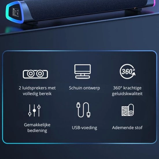 This soundbar not only brings impressive sound, but also brilliant lighting effects with its RGB rainbow lights on both sides. It adds a touch of style and ambiance to any room. This soundbar supports a wide range of devices with a standard 3.5mm connection, including PCs, laptops, tablets and smartphones (Please note: USB powered and not compatible with iMac).