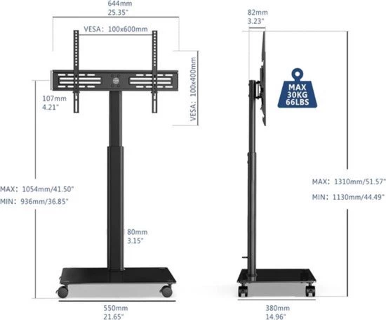 Our mobile TV stand offers a flexible and durable solution for positioning your television. The adjustable and swivel design ensures an optimal viewing angle, while the wheels make it easy to move the stand to any desired location. Perfect for both home and professional use, this TV stand offers the ultimate combination of functionality and style.