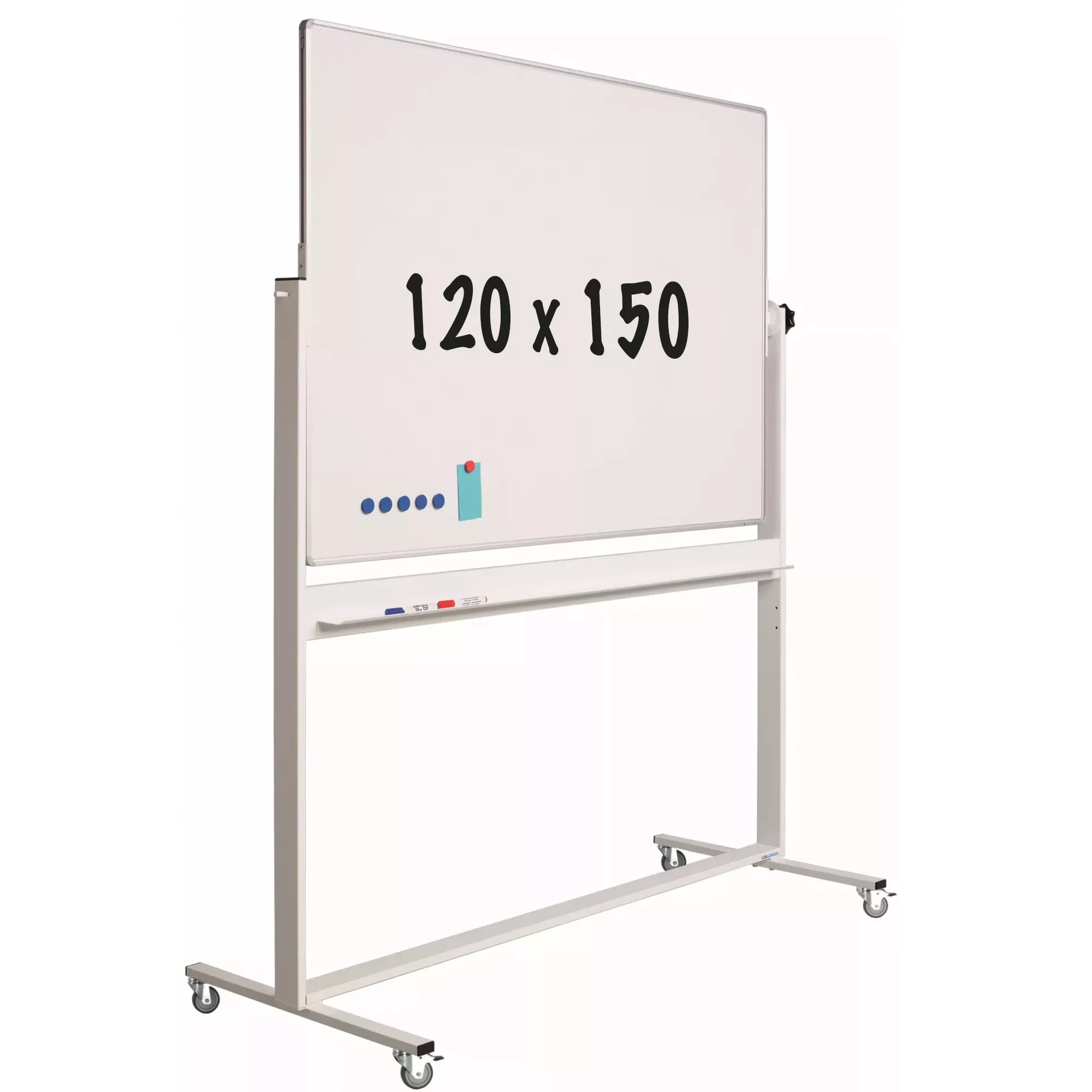 Whiteboard that can be written on on both sides of white enamel steel, with aluminum RC profile. The board can be rotated 360 by means of the rotary knob and can be fixed in any corner. The robust white steel rack is equipped with a long marker tray and 4 industrial wheels (2 with brakes), making it suitable for regular or intensive movement over uneven floors.