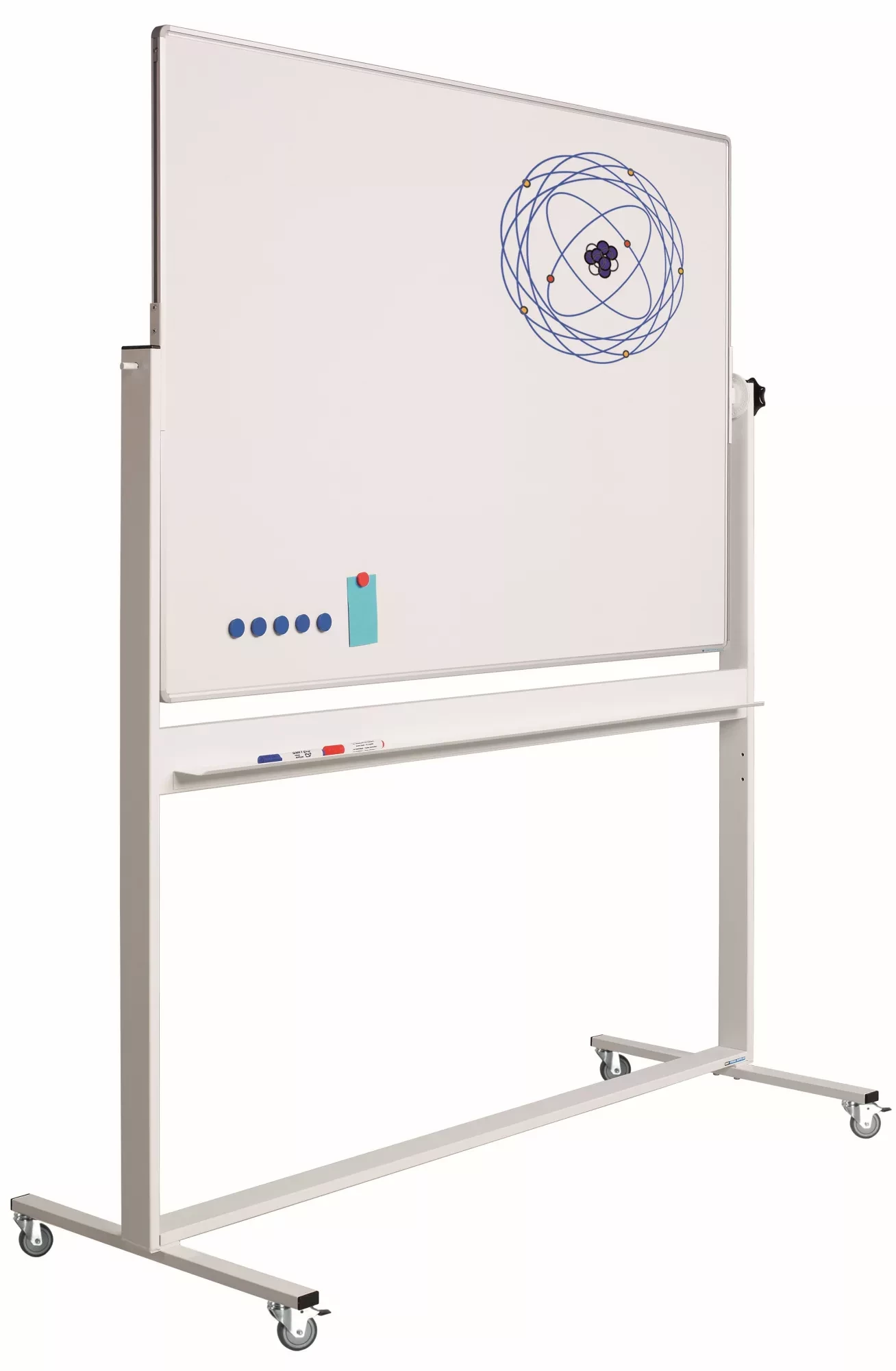 Whiteboard that can be written on on both sides of white enamel steel, with aluminum RC profile. The board can be rotated 360 by means of the rotary knob and can be fixed in any corner. The robust white steel rack is equipped with a long marker tray and 4 industrial wheels (2 with brakes), making it suitable for regular or intensive movement over uneven floors.
