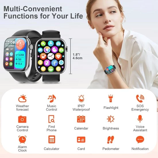 Discover the versatile smartwatch for men and women, perfect for any occasion. This advanced smartwatch features a bright 183-inch HD display and supports over 110 different sports modes. Monitor your health with the built-in sleep monitor, SpO2 sensor, and heart rate monitor. With IP68 water resistance, this smartwatch is ideal for both athletes and casual users. Compatible with both iOS and Android, it's the perfect fitness companion for everyone.
