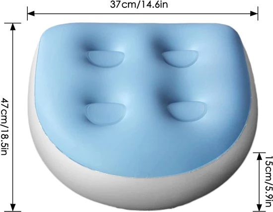 The dimensions of the cushion are 18.5 x 14.6 x 5.9 cm, making it suitable for most bathtubs and baths. The suction cups on the bottom ensure that the cushion stays in place and does not float or shift.