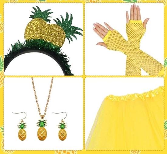 Complete Pineapple Costume Set: This set contains 6 pieces, including a pineapple headband, a pair of pineapple sunglasses, a pair of yellow fingerless gloves, a pineapple necklace, a pair of pineapple earrings, and a yellow tutu skirt. The bright yellow colors and unique accessories will instantly bring a summery vibe to your home.
