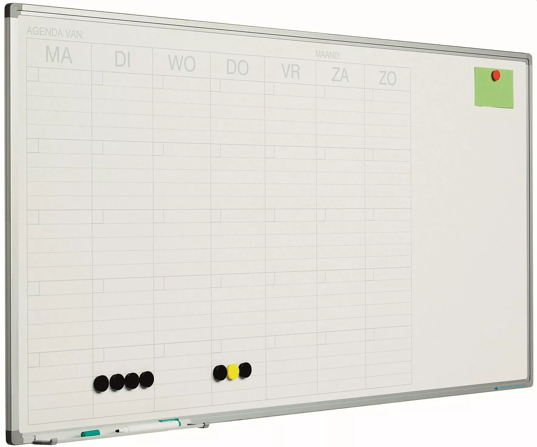 Weekly planner by horizontally pre-printed weekdays and vertically 5 rows of weeks. By numbering the positions from 1 to 31, this board is suitable as a monthly planner. Equipped with aluminum anodized softline profile including suspension material and marker tray 30 cm.