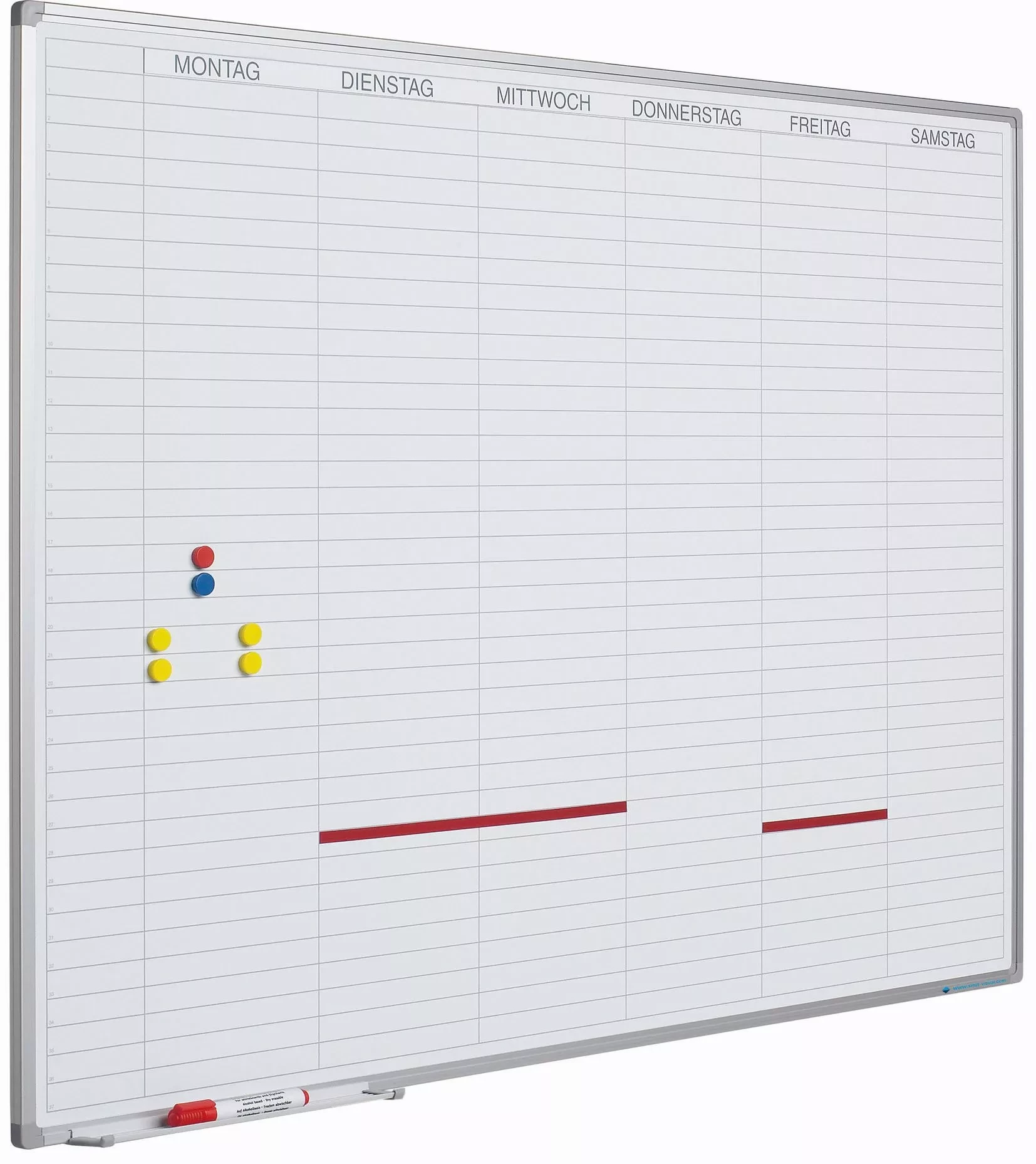 Workday planner with horizontal layout from Monday to Saturday with 37 fillable positions under each day. Equipped with anodised aluminum softline profile, including mounting material, marker tray 30 cm and magnetic horizontal day strip.
