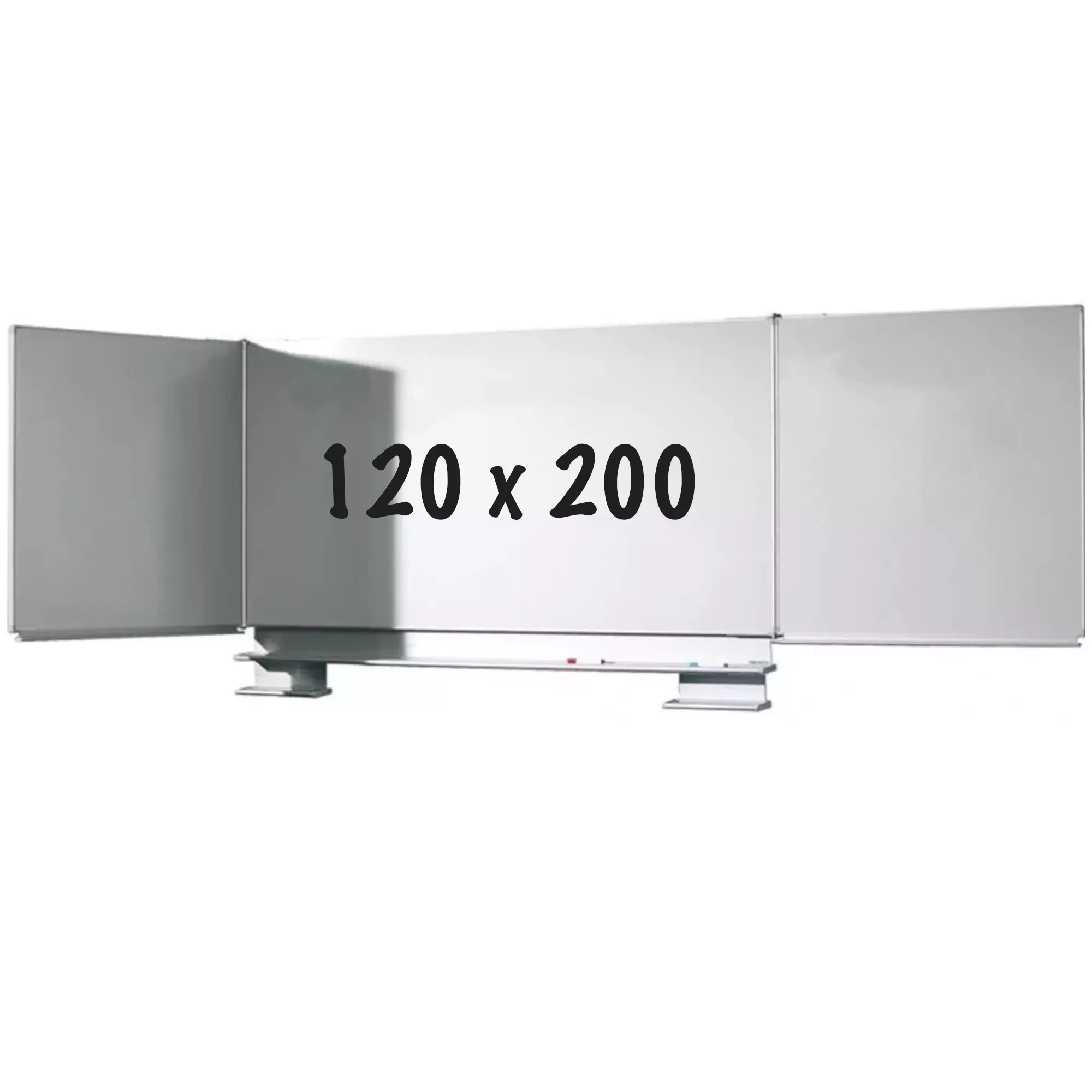 Board with 5 writing surfaces in enamel steel white (800C) or green. Anodized 19 mm aluminum profile with plastic corner pieces, including marker tray with two sponge trays and chalk collection trays at the bottom of the wings. Mounting on a fixed wall.
