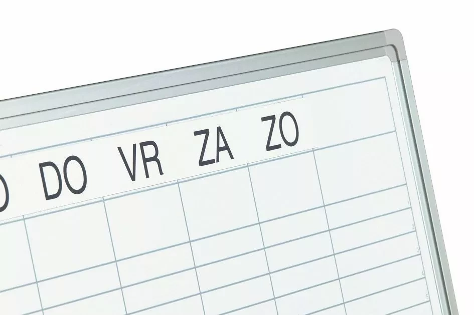 Weekly planner with horizontal two weeks side by side. Under each day there are 53 free positions. Equipped with anodized aluminum softline profile, including suspension material, marker tray 30 cm and magnetic day strip for double weekly planner.