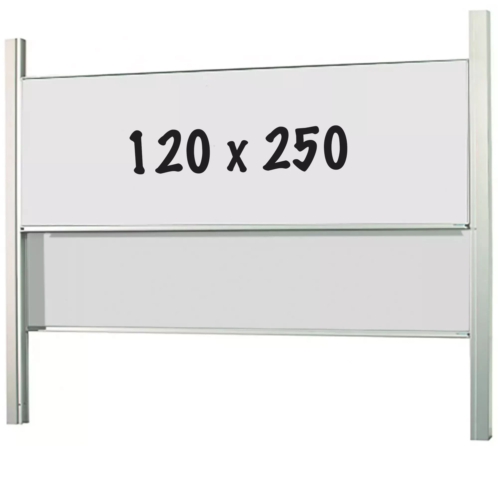 Two single-surface boards that can move independently of each other in height in white (800C) or green enamel steel. Anodized 19 mm aluminum profile with plastic corner pieces and chalk collection gutter. Mounting between two double columns, standard length: 265 cm. Longer columns: optional.